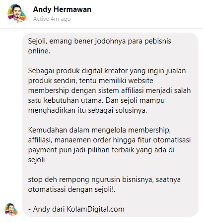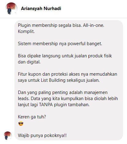 Sejoli bakal menjadi membership plugin paling lengkap fiturnya dan Indonesia banget.Saya sudah pakai. Saya paling suka sama fitur follow up email, sms, dan whatsapp. Meskipun kita masih butuh provider pihak ketiga untuk ini, setidaknya fitur ini sudah ada di Sejoli dan kita tidak perlu beli plugin lagi.Asyiknya, ini tidak melulu untuk produk digital, tapi juga produk fisik. Artinya, kita bisa bikin sistem reseller sendiri dan itu tercatat di sistem kita.Satu hal yang pasti, Sejoli memudahkan kita mengumpulkan data dan mengolahnya menjadi profit. Ini yang tidak ada di produk sejenis.