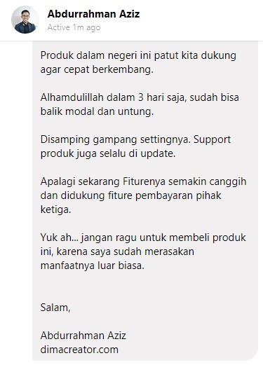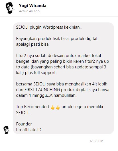 Alhamdulillah, hari pertama sejoli launching langsung beli. seminggu kemudian langsung launch ecourse. mungkin e course saya adalah pertama yang di launching menggunakan sejoli. dan sudah menghasilkan lebih dari Rp 150.000.000 dari 1 e course saja. developer dan supportnya keren dengan update berkala untuk berbagai fitur terbaru. Plugin Membership Luar pun Lewat 😁😁😁